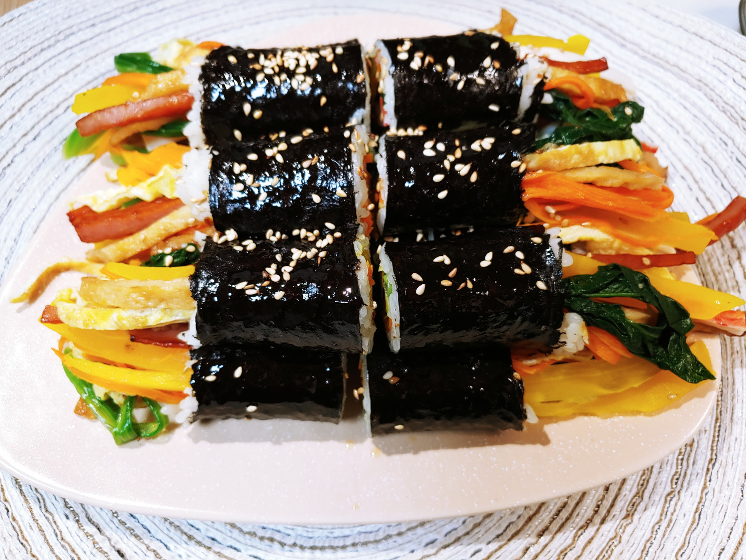 당근은 채 썰어 기름에 살짝 볶고, 시금치는 소금과 참기름으로 무쳐주세요. 계란은 얇게 부쳐 지단으로 썰고, 단무지는 물기를 빼주세요. 맛살은 전자레인지에 10초만 돌려 따뜻하게 하면 잘 말립니다.