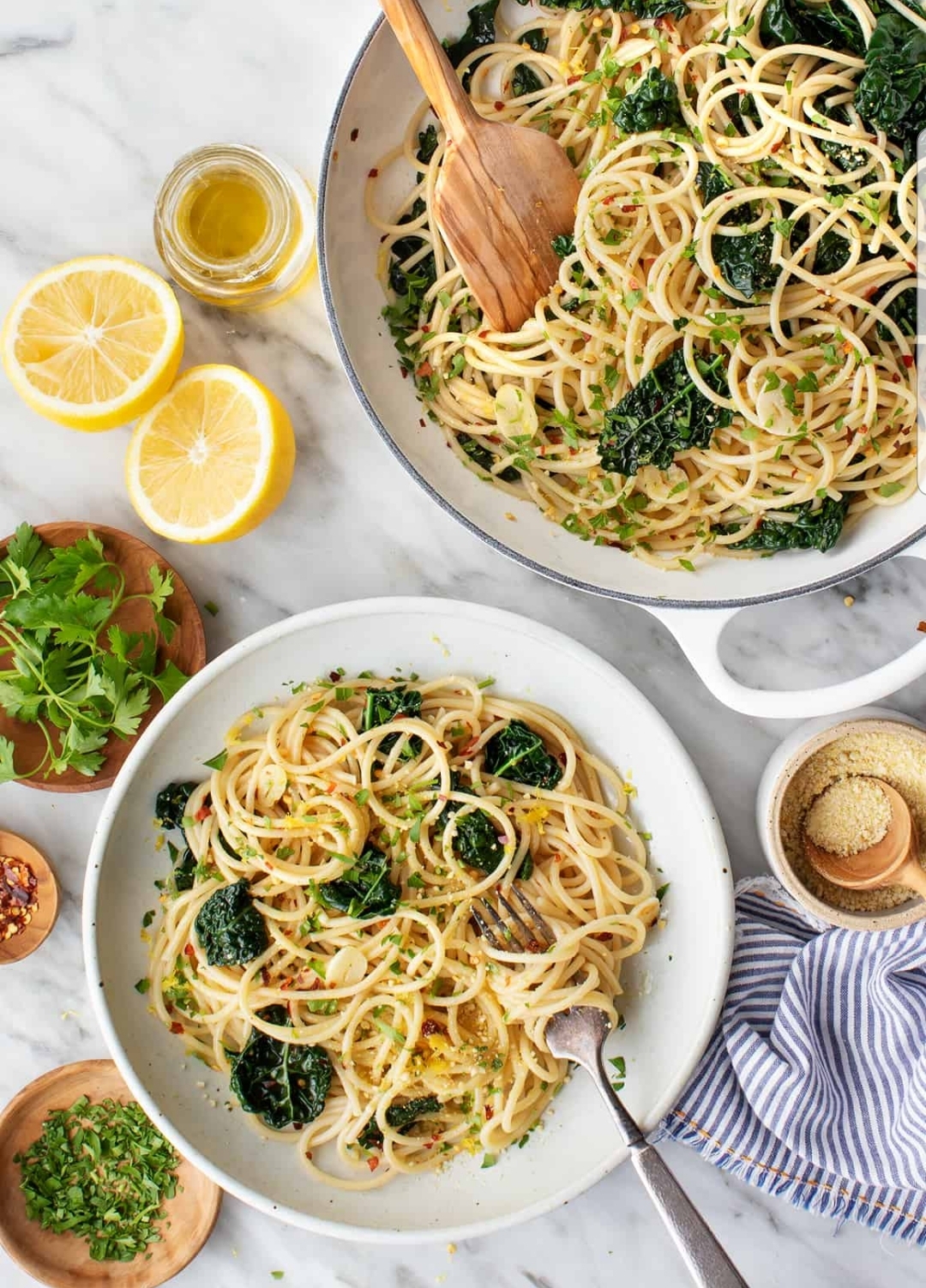 ⑥ 마무리 불을 끄고 파슬리나 바질을 뿌리고, 원하면 파마산 치즈를 추가한다. 매운맛을 조금 더 원한다면 페페론치노를 2~3개 추가해도 좋다.🔥